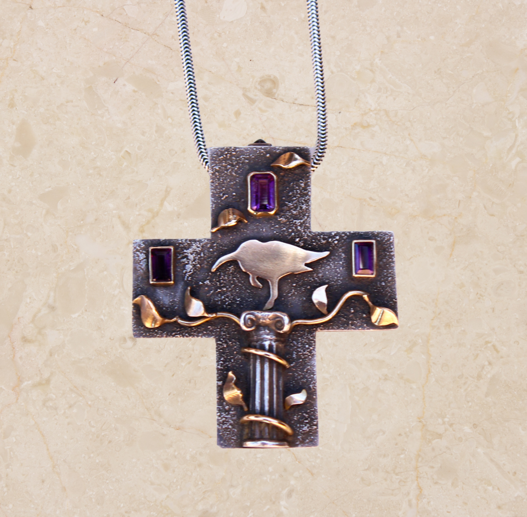 Cross pendant:14k gold, sterling silver, amethyst & peridot