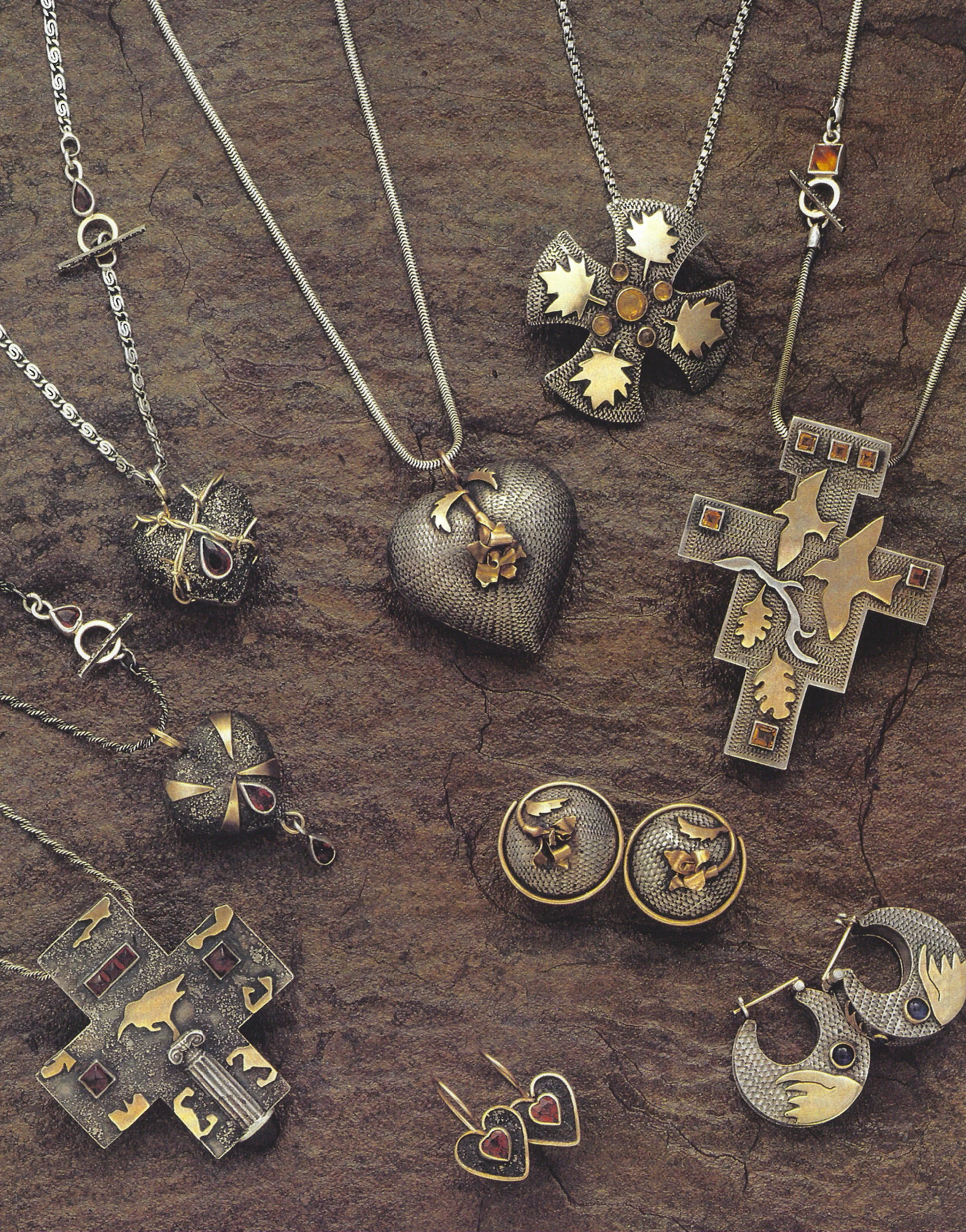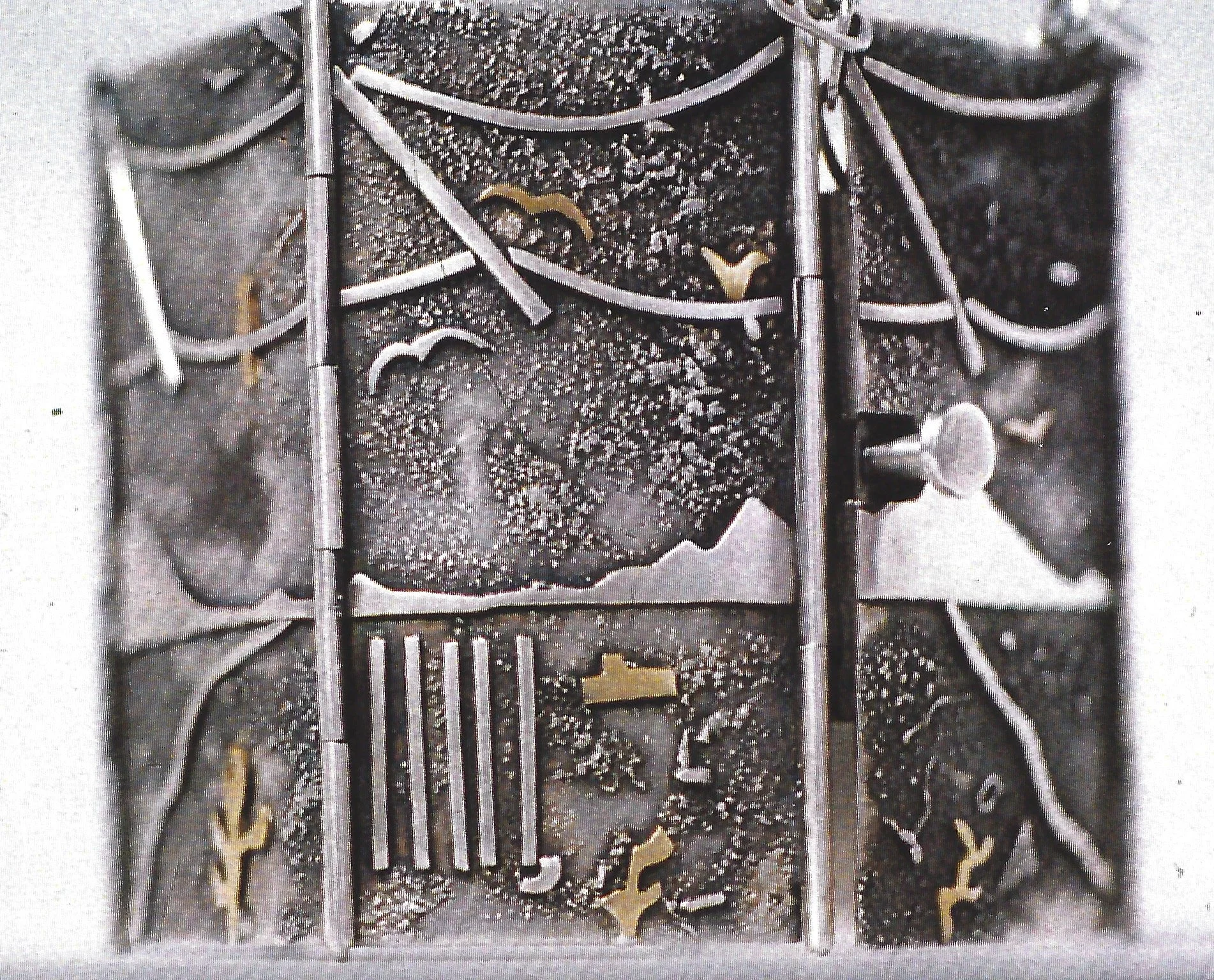 The prancing horse, crow, praying mantis, dove, rose, traces of bird’s wing, or leafy boughs, trembling in arid wind, are reminders of beautiful things seen everywhere. Isolated or repeated in gold, enhanced with colored stones on somber silver fields, these fragments are luminous apparitions of intense, sometimes buried, feelings.